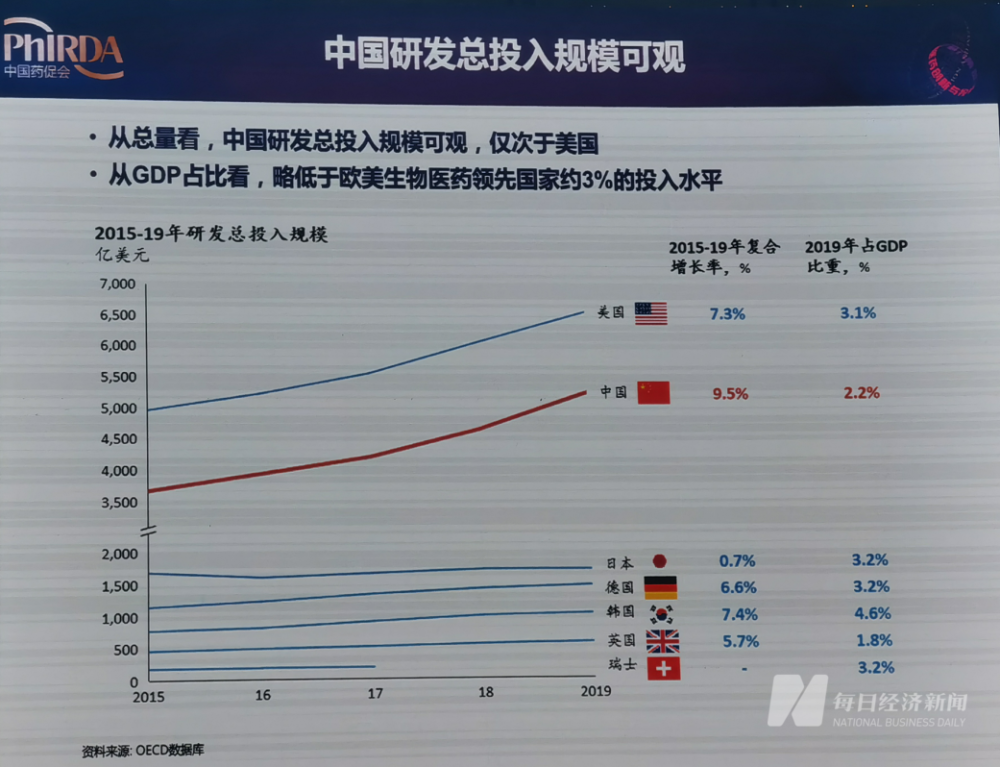 根据OECD(经合组织)数据库,从总量看,中国2015至2019年的研发总投入规模仅次于美国,并以9.5%的复合增长率在全球位列第一;但从GDP占比看,略低于欧美国家生物医药领先国家3%的投入水平。这两项数字说明中国医药创新研发需要雄厚资金的支持,并且这一情况在未来仍将持续。