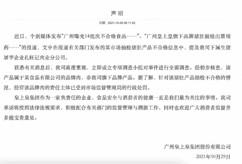 10月29日,广州皇上皇集团股份有限公司官网发布声明称,公司高度重视此事,立即成立专项调查小组对事件进行全面调查。经初步核查,该产品属于某食品有限公司的品牌肉,并非皇上皇旗下品牌产品。据皇上皇发布的声明信息显示,针对该猪肚产品抽检不合格的情况,经营该品牌肉的责任主体已受到市场监督管理局的行政处罚。