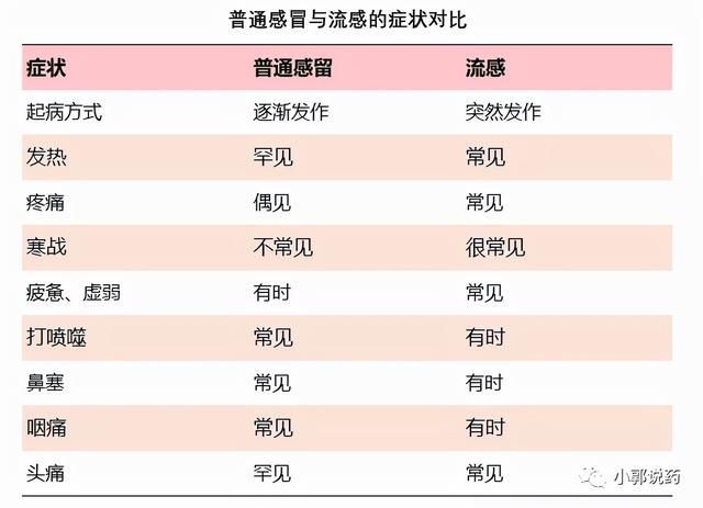 外周血白细胞总数不高或偏低,淋巴细胞比例相对增加;重症患者可有白细胞总数和淋巴细胞数下降。临床上一般不开展普通感冒的病毒学检查,主要用于流行病学研究。而流行性感冒(简称流感)起病急,具有较强的传染性,以全身感染中毒症状为主,呼吸道症状较轻。普通感冒与流感的症状对比详见下表。