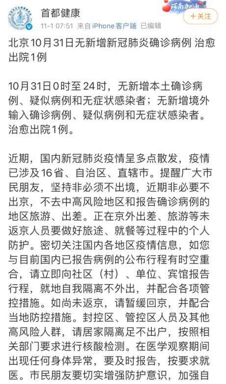 北京市卫健委11月1日发布通知称,在京外出差、旅游等未返京人员,如果与目前国内已报告病例的公布行程有时空重合,请暂缓回京。