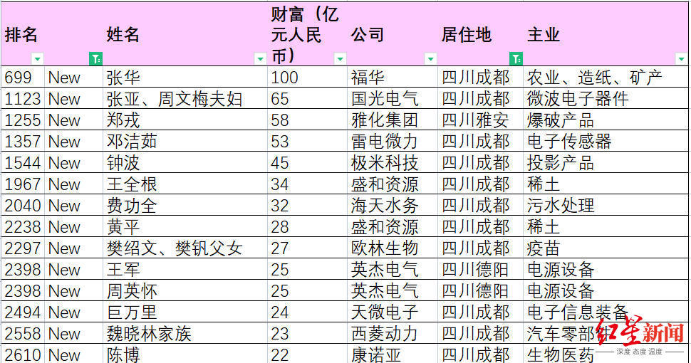 胡润百富榜单今年新增14位四川企业家,其中11位来自成都