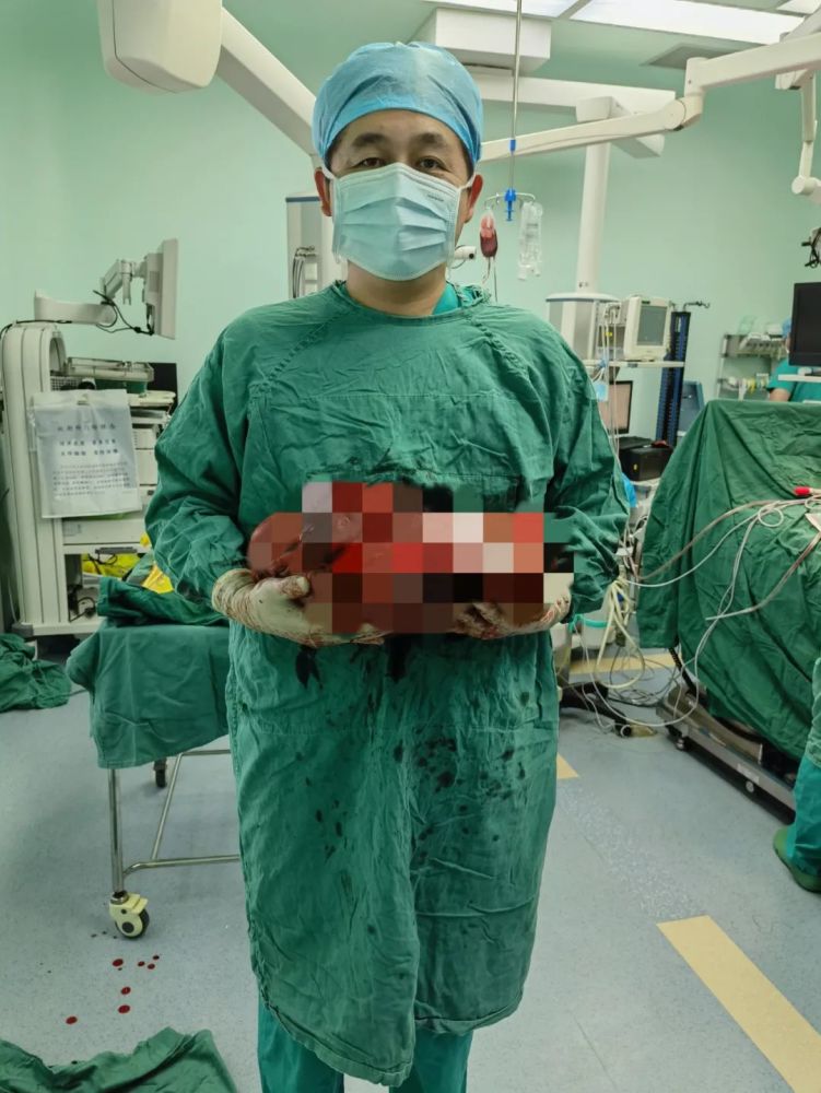 次日,在麻醉科刘志刚教授、刘康教授团队的保驾护航下,在泌尿外科主任刘修恒教授的指导下,吕胜启教授、陈晖教授手术团队“抽丝剥茧”,精细解剖和分离。经过近5个小时的艰苦奋战,最终顺利切除巨大肿瘤,解除“炸弹”危机。