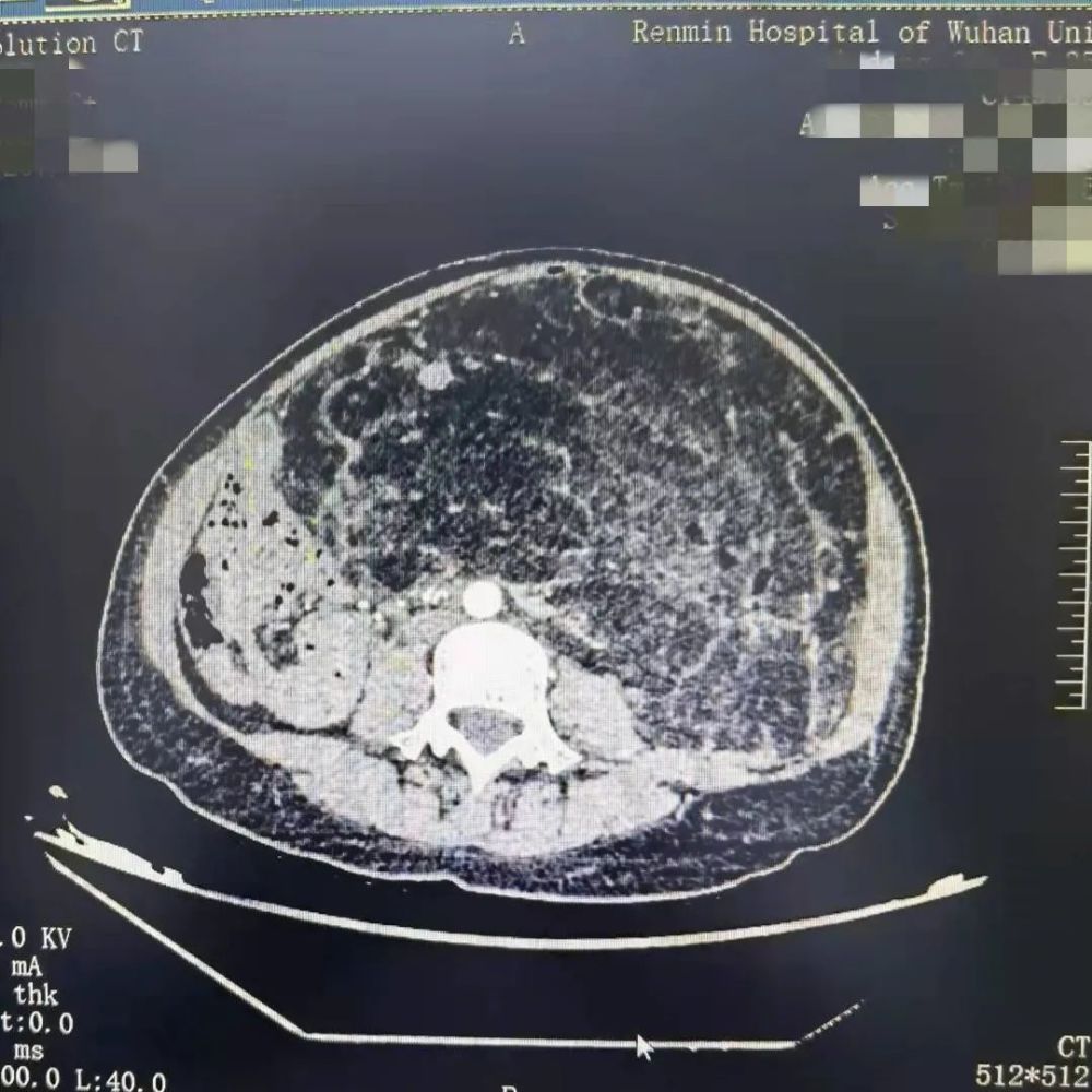 今年9月底,她发现自己的肚子明显变大了许多,左侧摸着还有硬硬的疙瘩。在当地医院CT检查发现,左侧的肾错构瘤已经疯长到了将近40厘米。由于肿瘤巨大,当地医院建议她到武汉治疗。