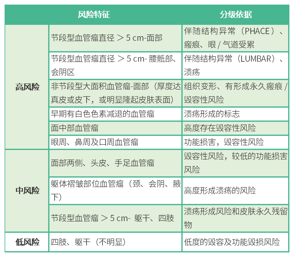 根据血管瘤分布的部位、形态大小可将血管瘤分为高风险、中风险和低风险三种类型,详见表 1[2]。