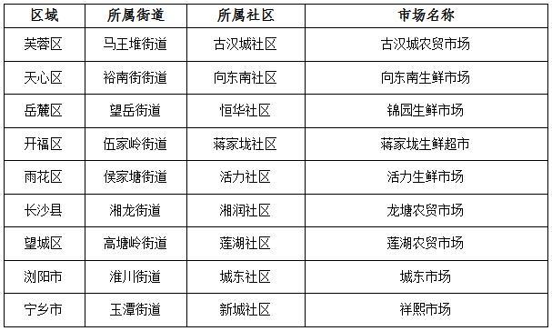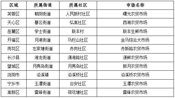 芙蓉区朝阳街道人民新村社区曙光农贸市场、天心区暮云街道弘高社区西湖农贸市场、岳麓区学士街道联丰村联丰生鲜市场、开福区月湖街道马栏山社区金马综合大市场、雨花区左家塘街道赤岗社区赤新路农贸市场、长沙县湘龙街道潇湘路社区潇鲜农贸市场、望城区月亮岛街道月亮岛社区新月农贸市场、浏阳市沿溪镇沿溪桥社区沿溪桥农贸市场、宁乡市玉潭街道合安社区玉潭农贸市场、高新区雷锋街道荷花塘社区雷锋农贸市场。