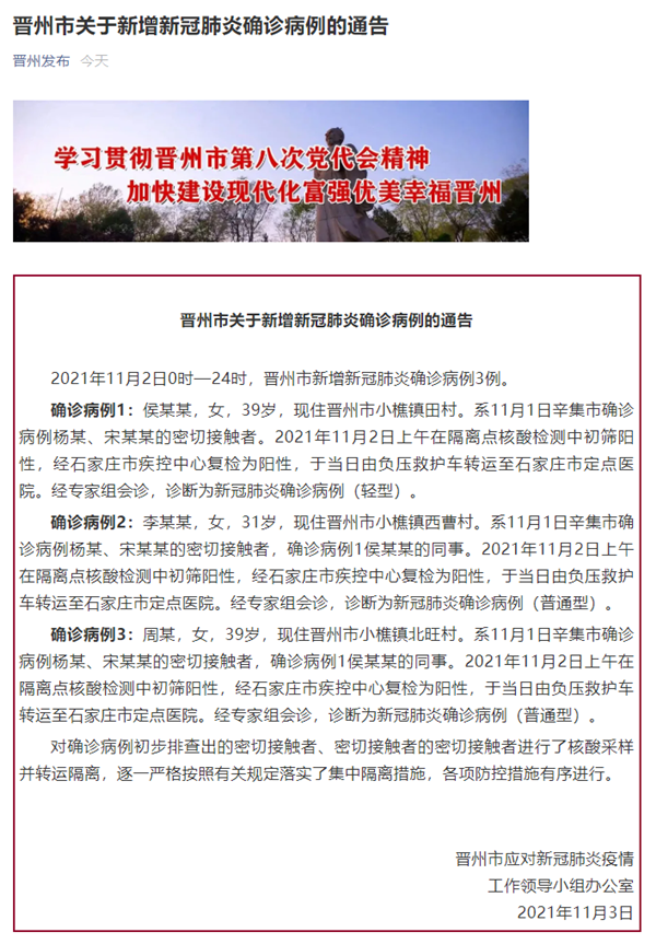 河北晋州11月2日新增新冠肺炎确诊病例3例