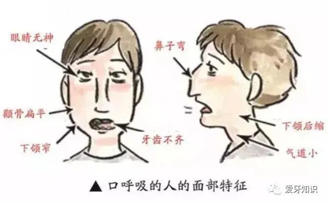 鼻子常会过敏与流鼻水,有严重口臭,放松状态时嘴巴张开,嘴唇容易干裂,牙齿排列拥挤,睡觉容易打呼或磨牙等。