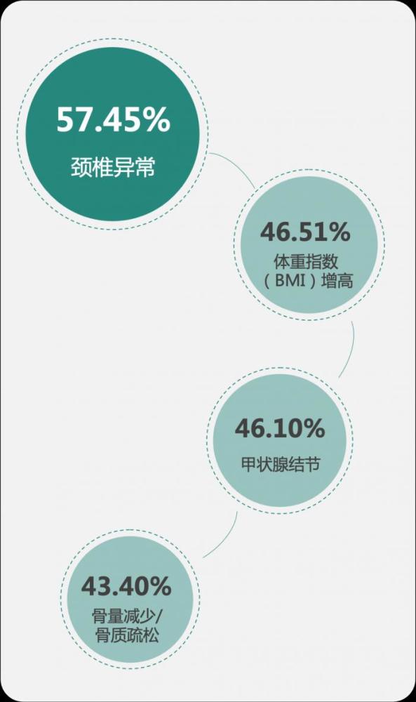 张黎刚特别指出,绿皮书根据2021年金融高净值客户体检套餐的组成和参与体检项目的到检率,选择了21项体检异常结果进行统计。除与性别相关的前列腺异常、宫颈异常等体检重要异常结果显示:颈椎异常在金融高净值客户中的检出率为最高,高达57.45%,往下依次为体重指数(BMI)增高、甲状腺结节、骨量减少/骨质疏松,检出率均超过40%。