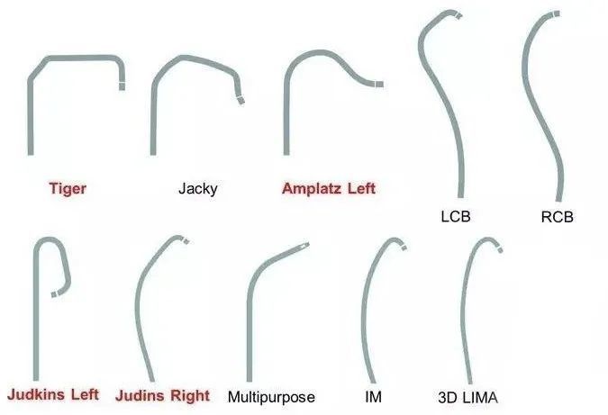 常用的造影导管有 Judkins 导管、Amplatz 导管、Tiger 导管等等,常分为左冠型号和右冠型号、也有大小尺寸之分。
