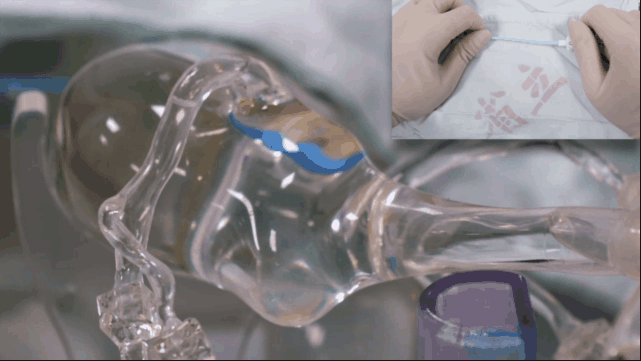 左手负责推送动作:使用左手拇指及食指在导管前端位置酌情进行来回推送,同时左手其余手指可顺势把控住穿刺的动脉鞘管、防止滑脱。