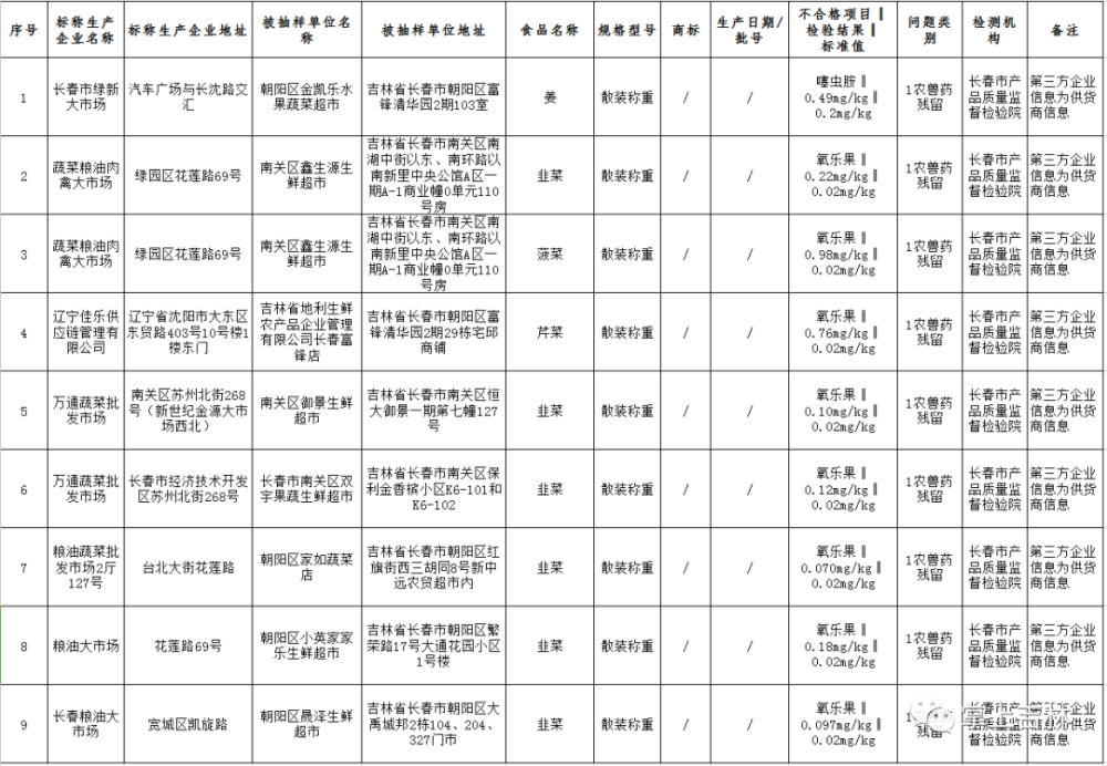 近期,长春市市场监督管理局组织抽检1类食品共494批次样品,其中:合格样品485批次,不合格样品9批次。不合格样品中:食用农产品9批次。 对抽检中发现的不合格产品,长春市市场监督管理局已通报属地市场监管部门依法予以查处。各属地市场监管部门已督促食品经营环节有关单位立即采取下架等措施控制风险。 特别提醒消费者,如购买或在市场上发现通告所列的不合格食品,请拨打投诉举报电话12315热线投诉举报。 具体抽检信息、检测项目等详见附件。长春市市场监督管理局2021年11月04日