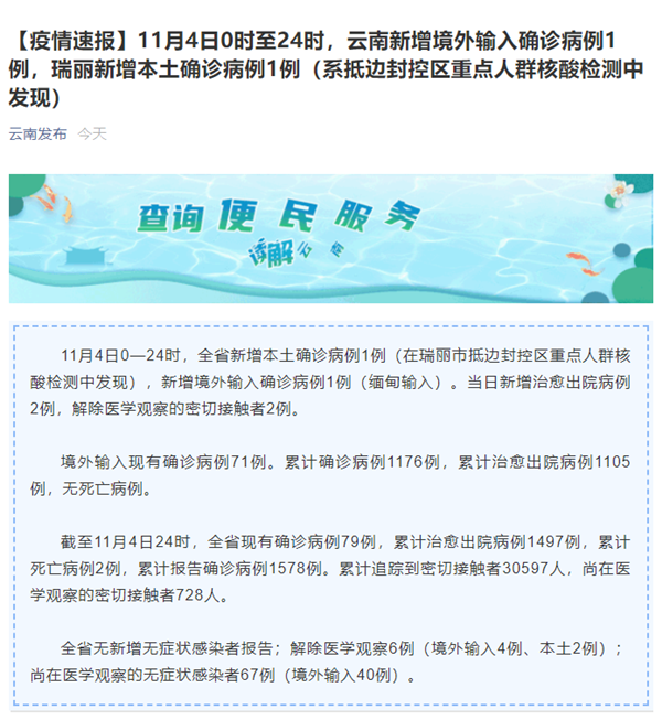 截至11月4日24时,云南全省现有确诊病例79例,累计治愈出院病例1497例,累计死亡病例2例,累计报告确诊病例1578例。累计追踪到密切接触者30597人,尚在医学观察的密切接触者728人。