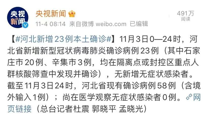 11月3日0-24时,河北省新增新型冠病毒肺炎阳性确诊病例23例,其中石家庄市20例,辛集市3例。截至11月3日24时,河北省现有确诊病例58例,其中本土病例57例。