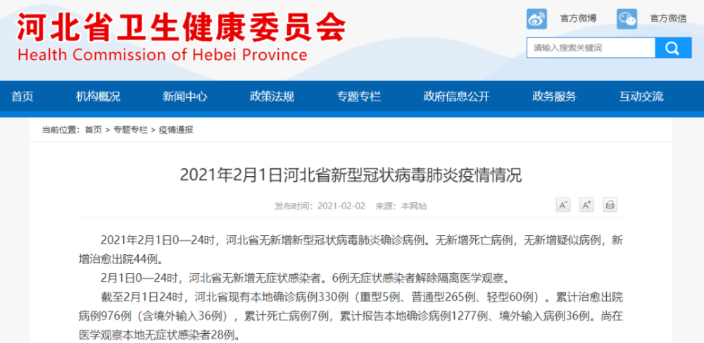 1月20日中疾控发布报告,河北疫情增长情况已经得到明显遏制。直到2021年2月1日0-24时,河北无新增本土病例、无新增本土无症状感染者。