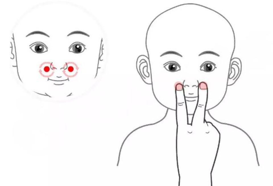 一手轻扶孩子头部,使头部相对固定,用另一手的食指和中指轻入孩子鼻孔轻揉,一次2分钟。