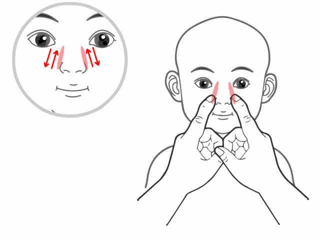 用双手的食指(或单手的食指和中指)指腹从眉间搓到迎香处,单方向往下,一次搓2分钟。基本上搓完鼻翼当场,孩子的鼻子就能通气了,不管是感冒的还是鼻炎的,当时就能见效。