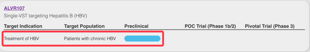 来自:AlloVir乙肝新药开发管道,可见ALVR107已处于临床前研究阶段