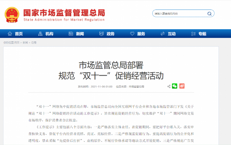 “双十一”网络集中促销活动在即,南都记者注意到,为规范促销经营行为,维护“双十一”期间网络交易市场秩序,保护消费者合法权益,11月6日,国家市场监督管理总局向全国互联网平台企业和各地市场监管部门下发《关于规范“双十一”网络促销经营活动的工作提示》,其中提出,要提高促销行为的公开化和透明度,禁止采取“先提价后打折”、虚构原价、不履行价格承诺等违法方式开展促销。
