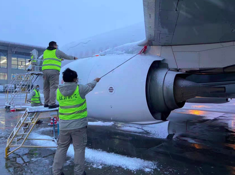 同时,河北航空大兴基地也同步开展冰雪天气应急处置工作,针对可能的大风雨雪天气,大兴基地对所有飞机进行严格系留,对飞机发动机进气道和风扇叶片等容易藏雪的部位,进行仔细除雪,并加装发动机保护罩,确保早航班顺利出港。