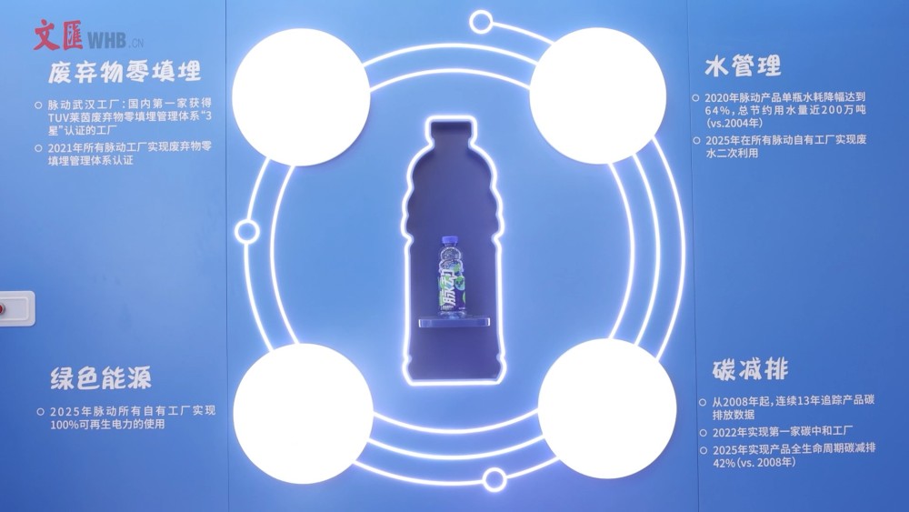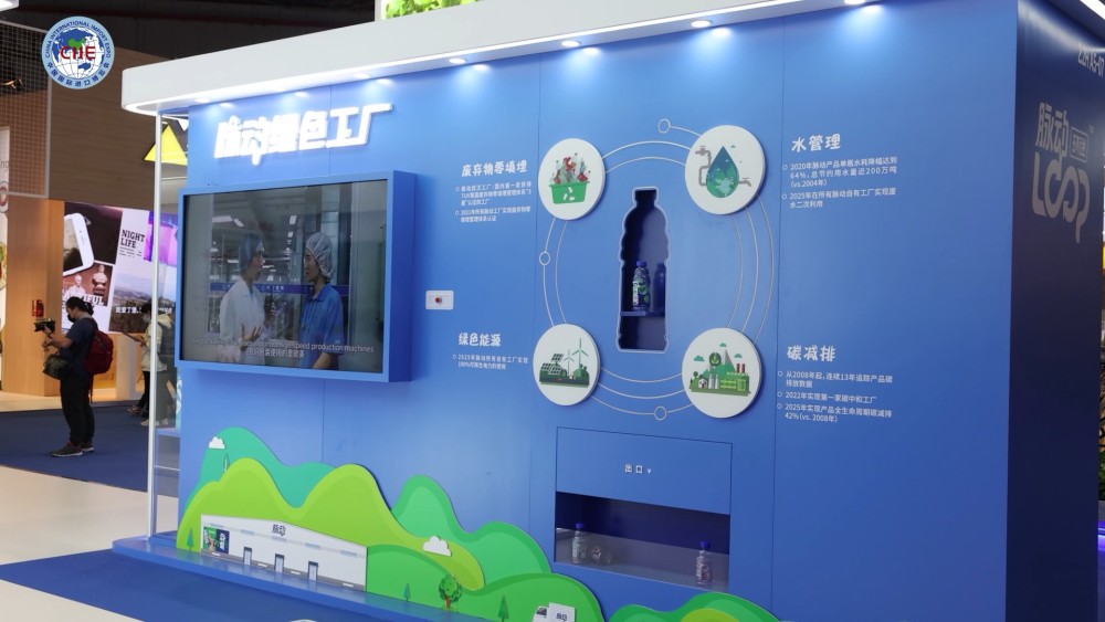 绿色消费需要绿色生产来支持。回收机一旁,展陈了工厂减碳减排减塑的纪录片,以及达能2050碳中和、中国2060碳中和的目标。据介绍,两家脉动中国工厂将于2022年实现碳中和。本届进博会上,达能宣布所有脉动工厂已通过德国莱茵TüV废弃物零填埋管理体系最高级别的“三星”认证。