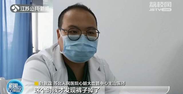这位医生叫叶敬霆,是苏北人民医院心脏大血管中心主治医师。他表示:“真不知道这个裤子是什么时候掉的,但是我们把最关键的地方做完了以后,开放循环了以后,高度紧张的状态才会松懈下来,这个时候才发现裤子掉了。”