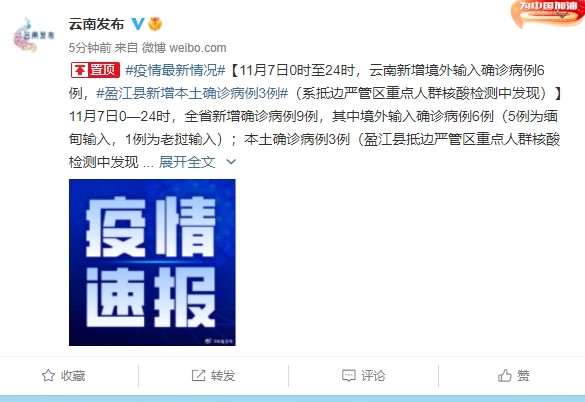 11月7日0时至24时,云南新增境外输入确诊病例6例,盈江县新增本土确诊病例3例(系抵边严管区重点人群核酸检测中发现)