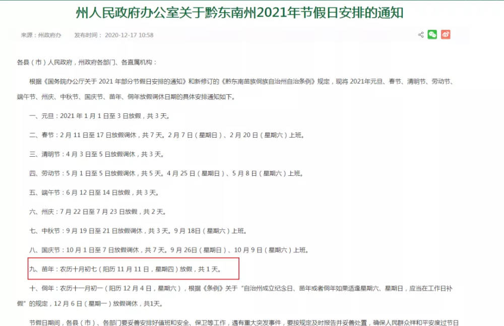 根据《州人民政府办公室关于黔东南州2021年节假日安排的通知》:今年的苗年是农历十月初七(阳历11月11日,星期四),放假1天。