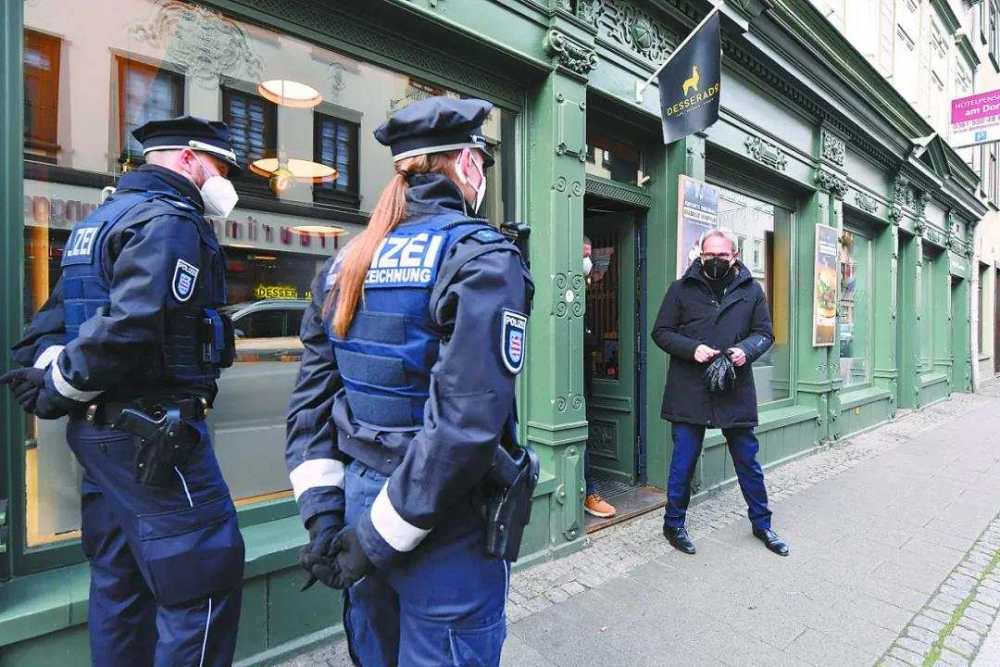 德国新冠肺炎疫情急剧恶化,25日报告单日新增确诊病例首次突破7万例,累计死亡病例超 过10万例。图为图林根州首府爱尔福特的警务人员在进行防疫检查。