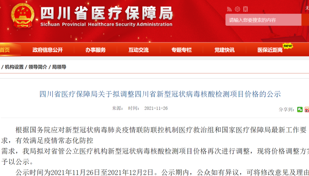 - 四川拟下调新冠核酸检测项目价格,单检40元/人次2021-11-27 11:59:57