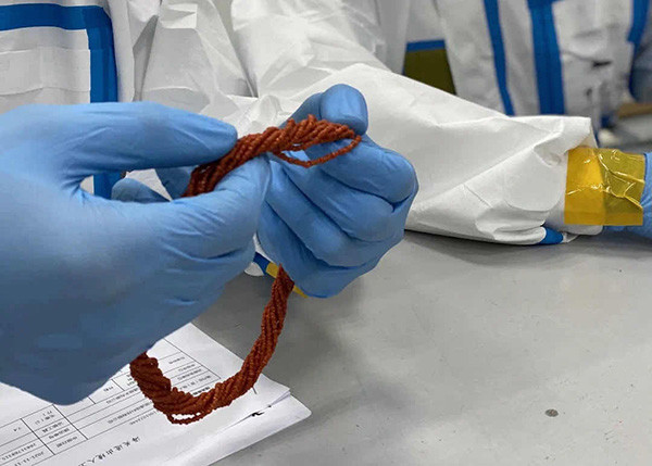 11月29日,澎湃新闻(www.thepaper.cn)记者从上海海关获悉,近日,上海浦东机场海关关员在上海空港快件渠道对进出境快件开展监管。经风险分析,一批次含有申报名为“DARMESEQ叙利亚珊瑚项链”的25个入境快件引起了关员注意。经开箱彻查,货物为各类饰品共102件、重2015.1克,饰品上镶嵌着光洁细腻的红色颗粒疑似珊瑚制品。