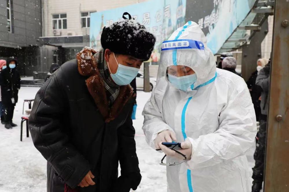 满洲里志愿者帮助市民扫描健康码。图片源自“魅力满洲里”