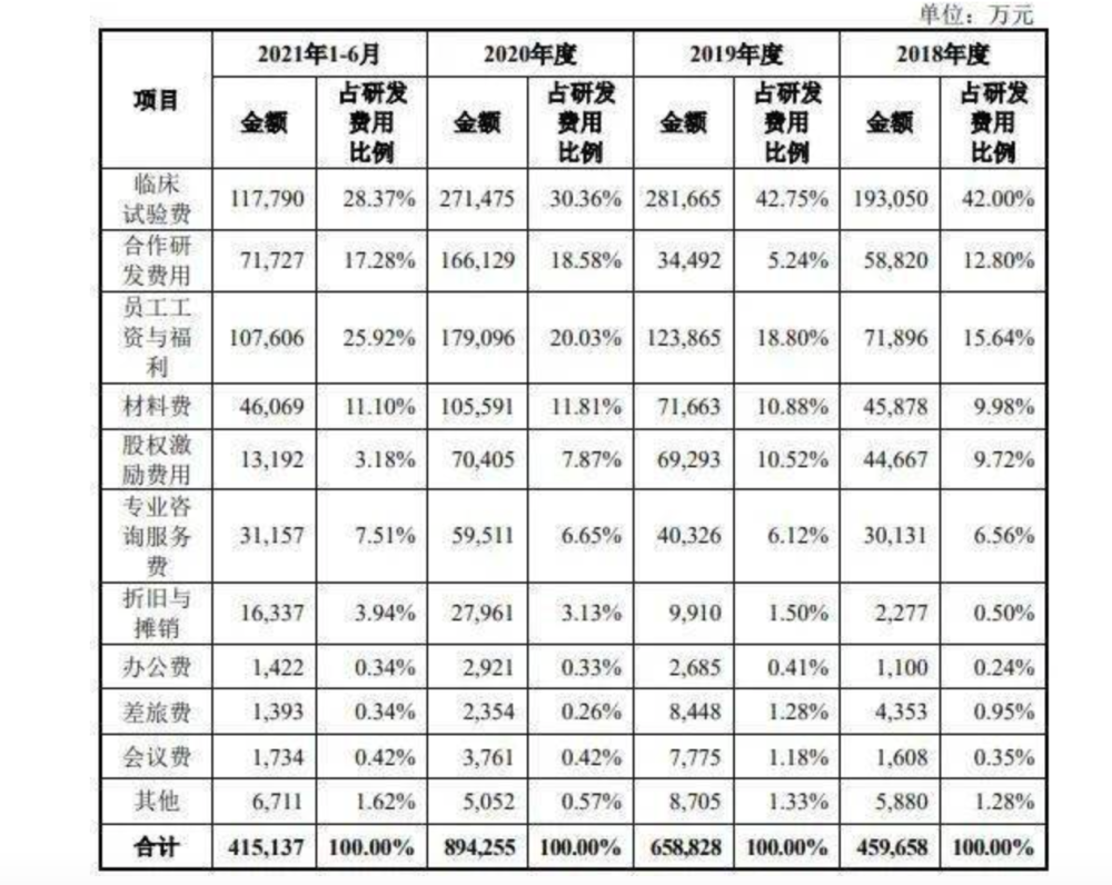 不断亏损的背后,是百济神州研发费用持续增长。2018年度、2019 年度、2020年度及截至 2021年6月30日止六个月期间,百济神州研发费用分别为459,658万元、658,828万元、894,255万元和 415,137万元。研发费用主要包括临床试验费、 合作研发费用、员工工资与福利费、材料费及研发人员股权激励费用,合计占研发费用比例在80%以上。