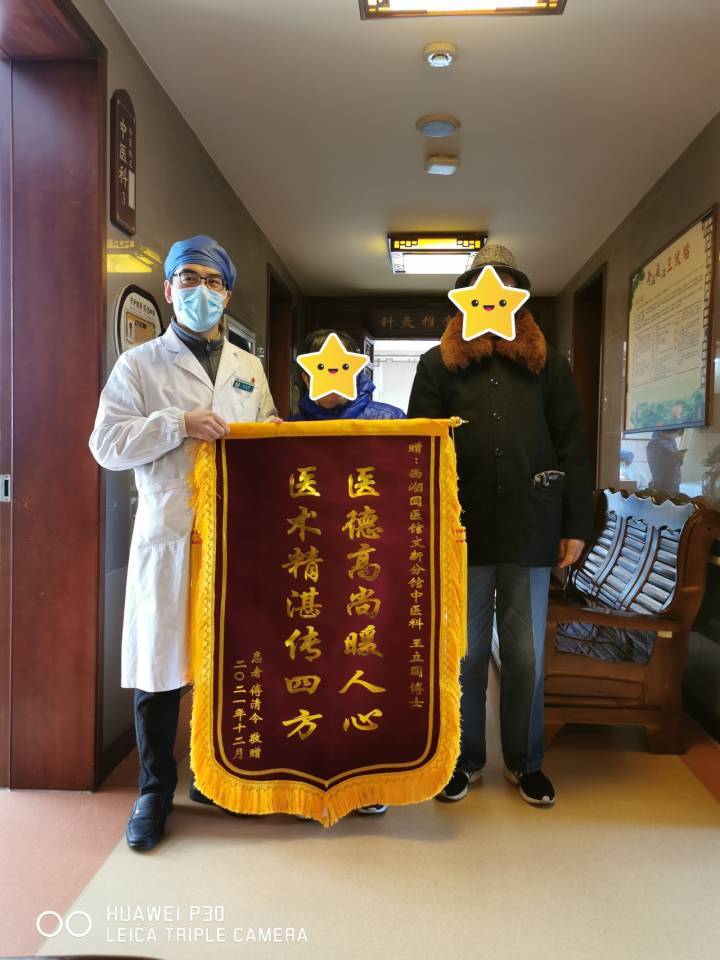 11月30日一大早,傅奶奶和老伴带着锦旗来到杭州西湖区文新街道社区卫生服务中心,说要把锦旗送给中医师王立国博士。