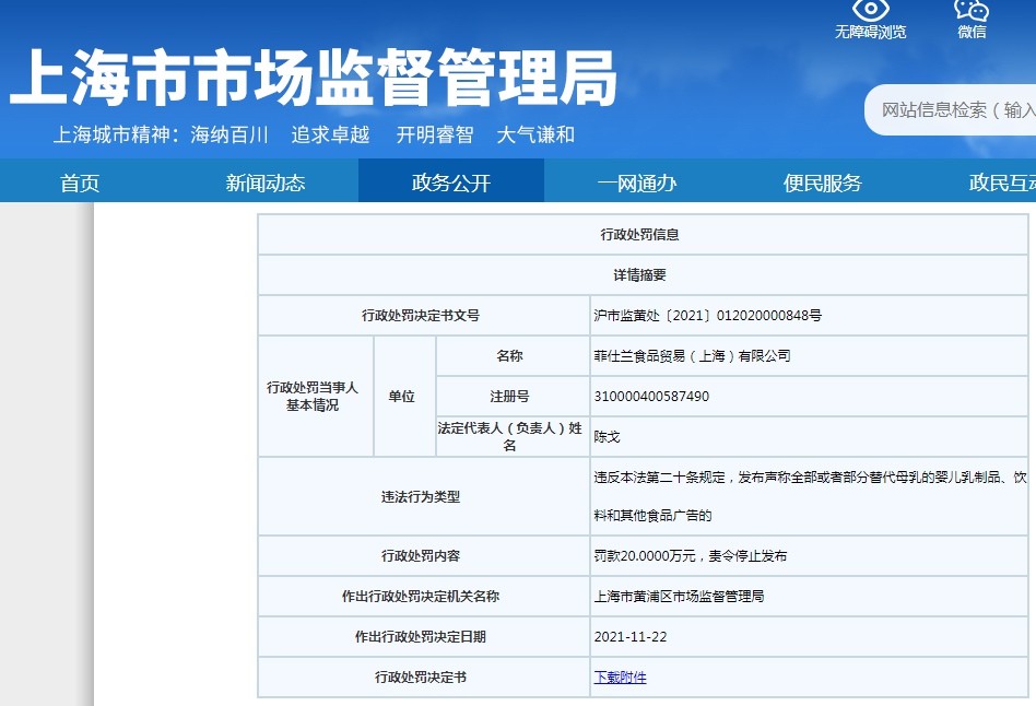 沪市监黄处〔2021〕012020000848号罚单显示,当事人为菲仕兰食品贸易(上海)有限公司。具体来看,2020年7月16日,上海市黄浦区市场监督管理局接举报,称天猫网络平台商店“皇家美素佳儿官方旗舰店”中,在一款名为“【皇家美素力】荷兰原装进口奶粉1段800g*1(适用0-6个月)”的产品宣传页面中有“天然含有乳磷脂、天然含有OPO类似结构脂、天然乳铁蛋白……科技解密母乳珍稀营养”“亲近源乳比例、促进DHA吸收珍稀乳磷脂营养组成比例接近源乳”等内容。