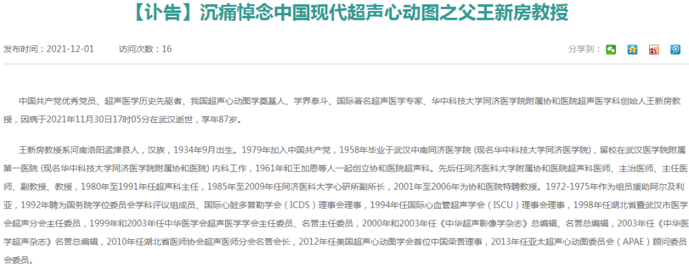 华中科技大学同济医学院附属协和医院官网12月1日信息显示,11月30日17时05分,超声医学历史先驱者、我国超声心动图学奠基人、华中科技大学同济医学院附属协和医院超声医学科创始人王新房教授,因病在武汉逝世,享年87岁。他在国际上创造多个学界第一,2011年被国际心血管超声协会授予“现代超声心动图之父”称号。