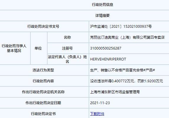 中国经济网北京12月2日讯 中国经济网记者在天眼查看到,近日,克丽丝汀迪奥商业(上海)有限公司第四专卖店新增行政处罚信息,因其生产、销售以不合格产品冒充合格产品被上海市浦东新区市场监督管理局罚款1.92万元,并没收违法所得约4000元。