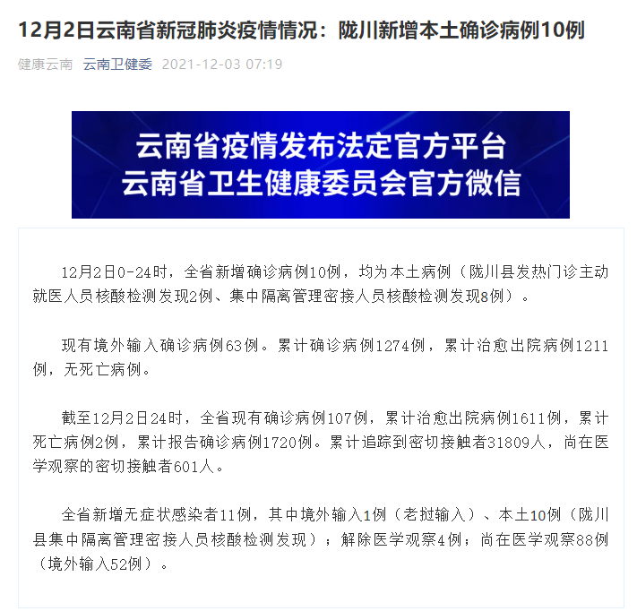 12月2日0-24时,云南全省新增确诊病例10例,均为本土病例(陇川县发热门诊主动就医人员核酸检测发现2例、集中隔离管理密接人员核酸检测发现8例)。