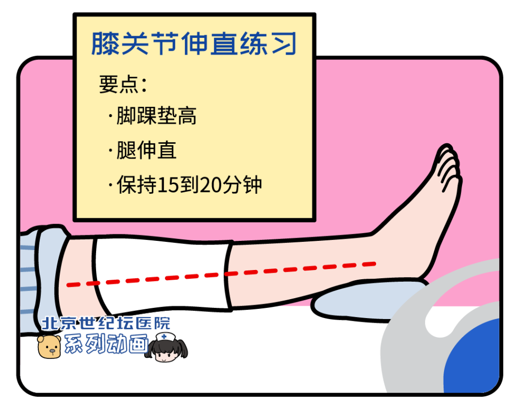抬高患肢、踝泵运动、膝关节伸直练习、膝关节屈曲练习、股四头肌等长收缩练习、股四头肌等张收缩练习