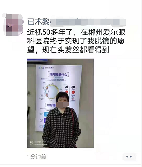 黎阿姨无比激动地说:“原以为往后几十年都要在这种模糊中度过,如今眼睛好了,感觉世界都变美好了。”术后第二天,黎阿姨立马发了条朋友圈,告诉大家伙儿,近视50多年了,终于实现了脱镜的愿望,现在头发丝都看得到。太后悔没早做,白遭这么多罪。
