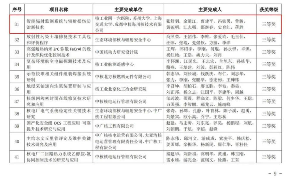 “智能辐射监测系统与辐射损伤防治新技术”项目由成都医学院第二附属医院 核工业四一六医院牵头,联合苏州大学、上海交通大学等机构共同完成。