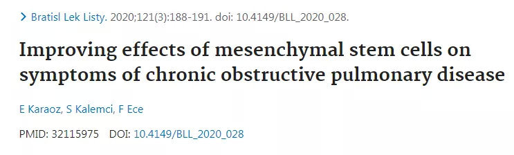[6] Karaoz E, Kalemci S, Ece F. Improving effects of mesenchymal stem cells on symptoms of chronic obstructive pulmonary disease. Bratisl Lek Listy. 2020;121(3):188-191. doi:10.4149/BLL_2020_028.