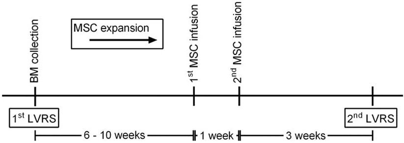 根据2016年发表的文献[4],研究人员挑选了10名重度肺气肿、即将接受肺减容手术(LVRS)的患者。在2次LVRS之间,接受2次自体间充质干细胞输注,间隔1周。