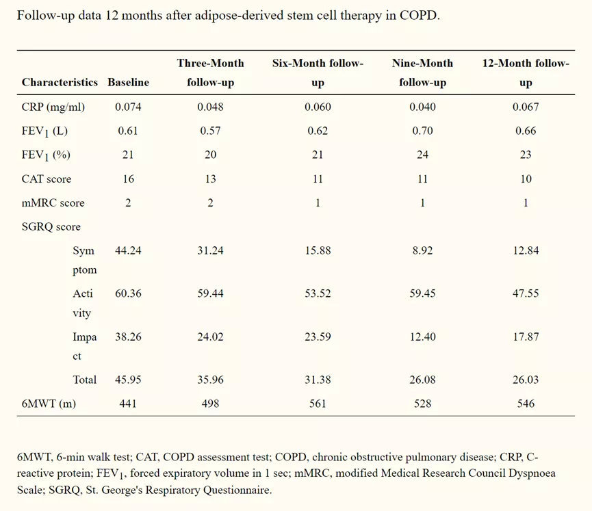 2019年,越南当地医院接诊了一位57岁的患有慢阻肺的患者,并为他实施了脂肪来源干细胞的治疗。患者入院前,曾经历2次慢阻肺的急性加重。吸入支气管扩张后,他的1秒内用力呼气量 (FEV1)为 21%,FEV1/(FVC)为40%。在治疗后的一年的随访期间,患者的呼吸困难和生活质量均有改善,同时未出现任何急性加重[5]。