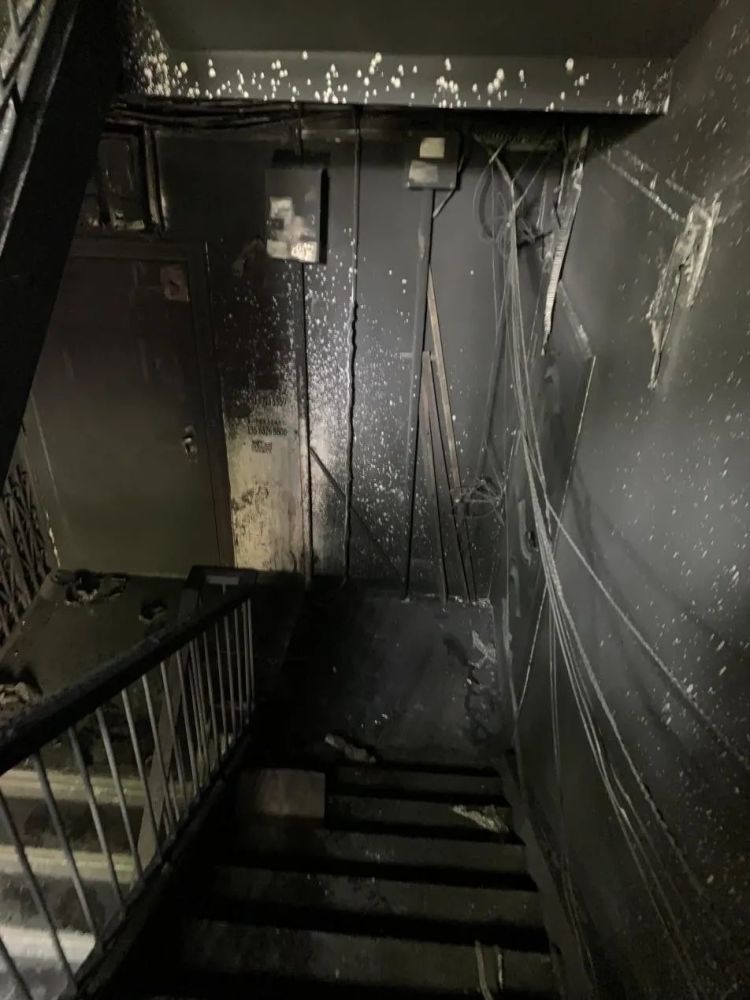 又过了一阵,听到了敲门声,我小心翼翼开了门,发现已经能看清下楼的路了。此时我还顾虑了一秒,想着自己的花花睡衣是不是太短了。算了命要紧,我还是赶紧下楼吧。被烧过的楼梯像饼干一样酥脆,走过之处都在掉渣,整个楼道被熏得漆黑,楼层间的窗户和窗框都被烧化了,完全不是平日熟悉的样子。