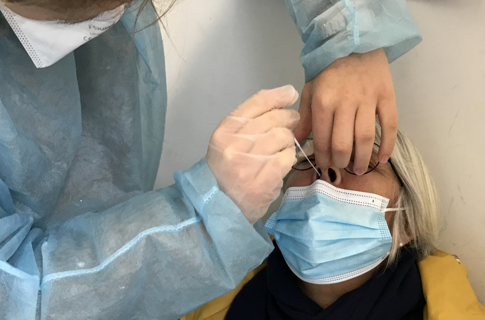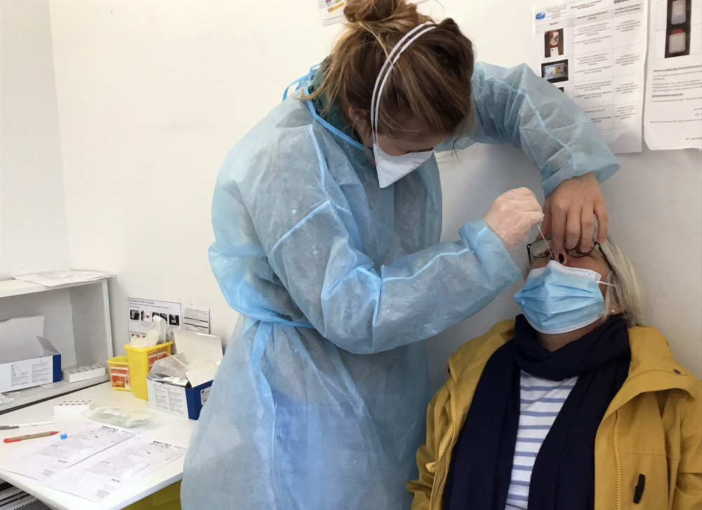 12月4日,一名女子在法国巴约讷附近的一处药房接受新冠检测。新华社/美联