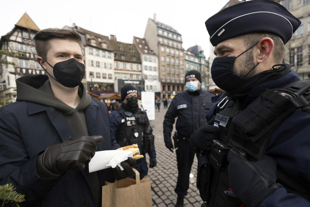 12月3日,警察在法国斯特拉斯堡的圣诞市场检查游客的防疫信息。新华社/美联