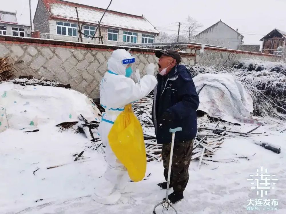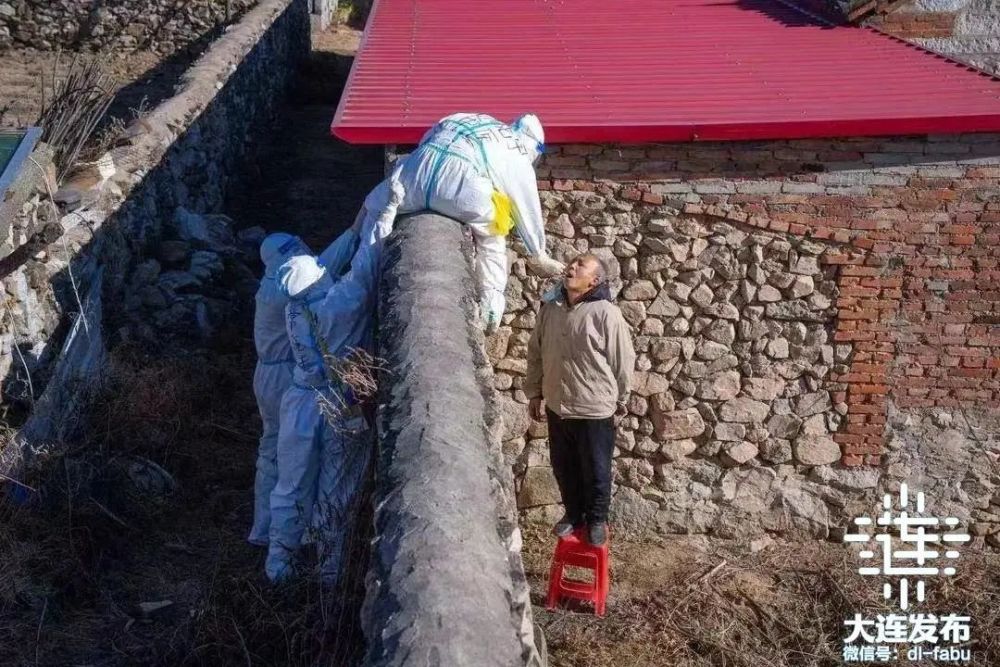 ▲ 在庄河,医疗队走村串屯进行采样,有的队员爬上墙头为村民进行采样。