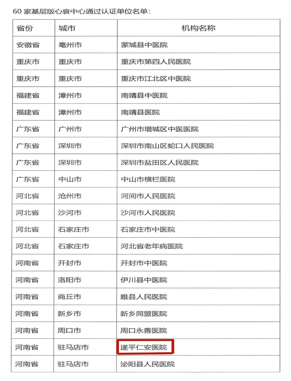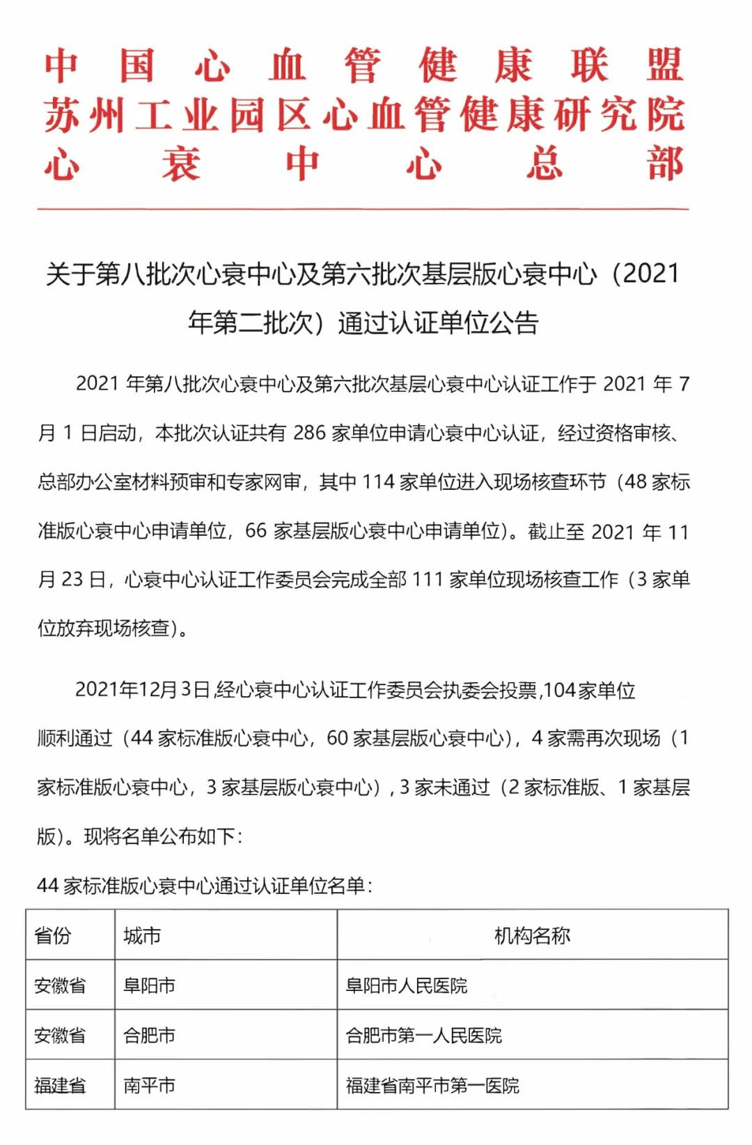 本报讯(记者丁宏伟通讯员孙丹)12月3日,中国心衰中心总部发布《关于第八批次心衰中心及第六批次基层版心衰中心(2021年第二批次)通过认证单位公告》,经资格审查、总部预审、专家网审及现场核查,包括遂平仁安医院在内的104家医疗卫生单位顺利通过认证,成为国家级基层版心衰中心。