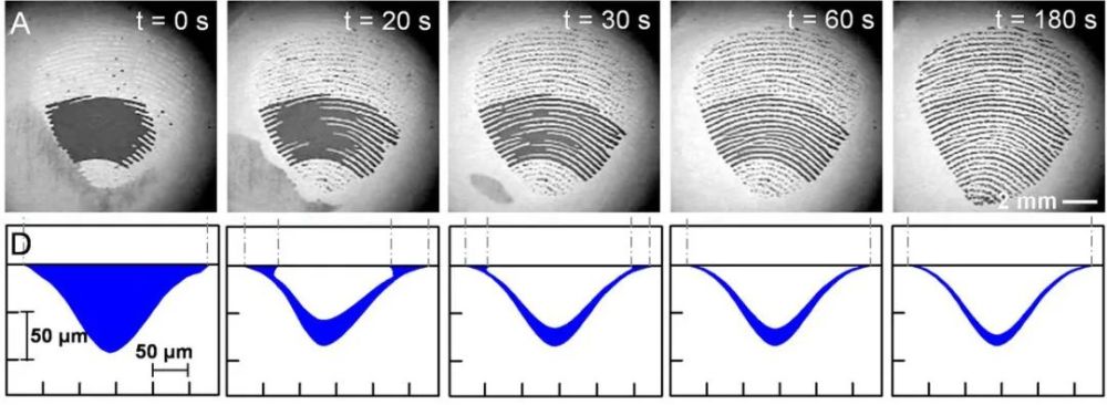 (潮湿状态下,指纹中汗水在180秒内蒸发变干的过程。A:指纹接触面的光学图像;D:指纹凹槽内的水分变化横截面,来源:文献[2])
