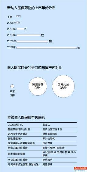 南都记者注意到,相比肿瘤药物调入医保,罕见病药物调入医保更受各界的关注。从数量上来看高于去年的5种,涵盖的罕见病包括血友病、遗传性血管性水肿、髓性肌萎缩症、多发性硬化、法布雷病、家族性高胆固醇血症、甲状腺素蛋白淀粉样变性心肌病、克罗恩病等。